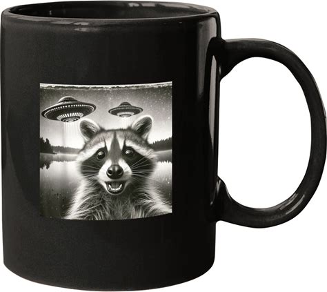 Alien Invasion Raccoon Selfie Mug - Sci-Fi Humor Black Ceramic Coffee Cup, 11Oz - Unique Gift For Space Fans And Animal Lovers