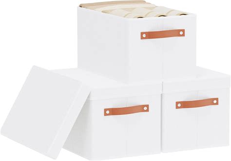 3 Pack Large Fabric Storage Boxes With Lids (15.75" X 11.25" X 11.25") - Decorative Bin With Lid, Label Holder, Faux Leather Handles - Large Storage
